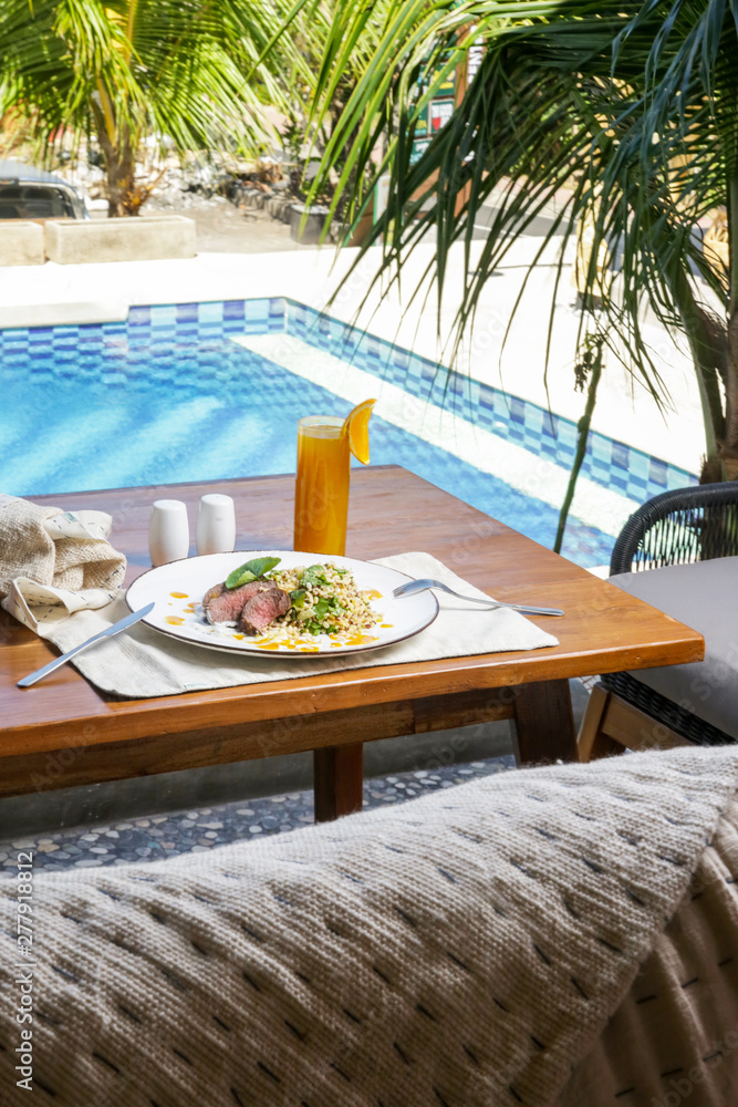 Lamb tenderloin served with a glass of freshly squeezed orange juice, a meal on the table next to the swimming pool