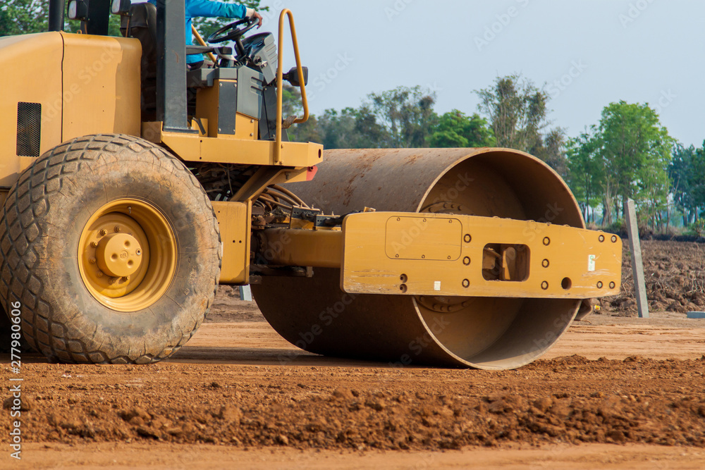 Vibratory roller compactor working on new road construction site. Heavy machinery for earth work in construction industrial.