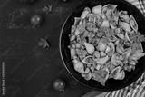 Conchiglie pasta. Italian pasta shells with mushrooms, zucchini and tomato sauce. Top view