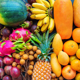 Set fresh organic exotic tropical fruit on dark