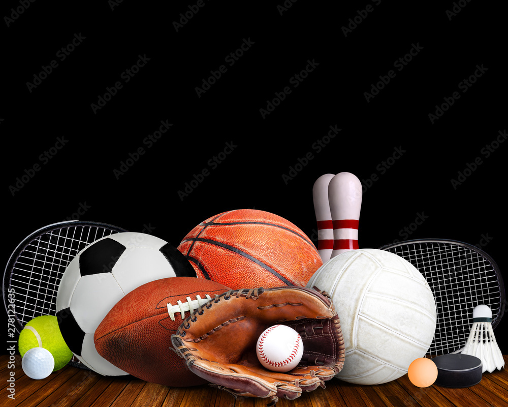 Sports Equipment, Rackets and Balls Isolated on Black Background