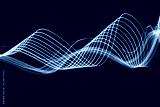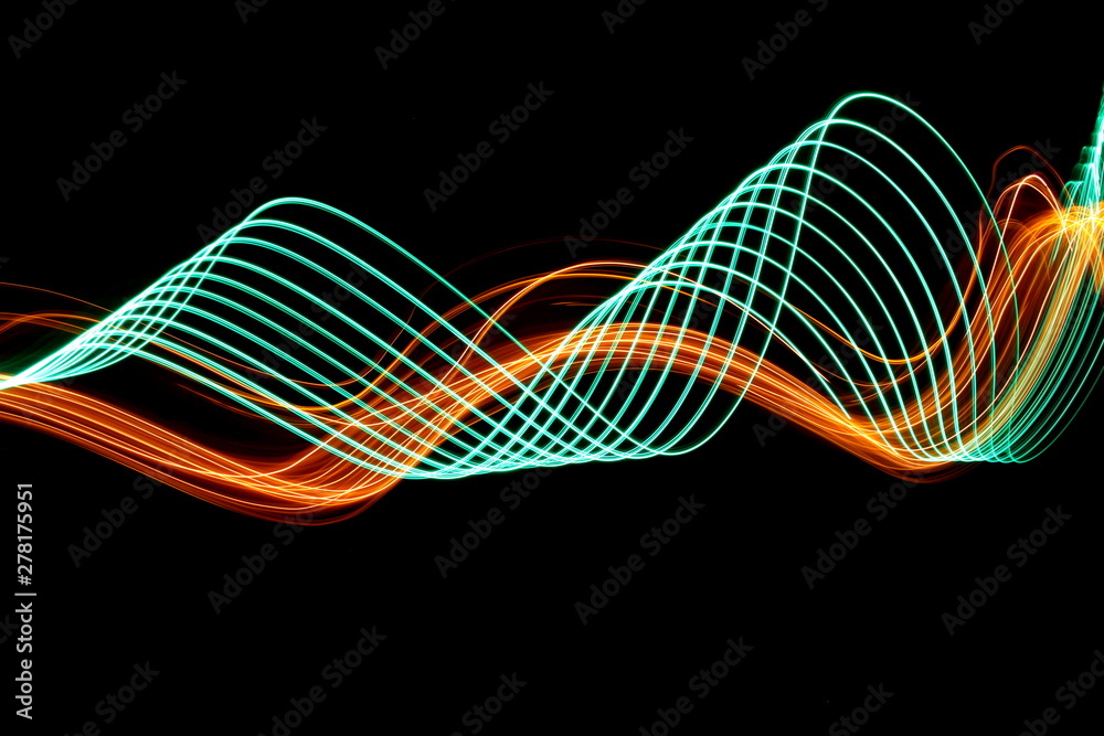 Long exposure photograph of neon green colour in an abstract swirl parallel lines pattern against a black background. Light painting photography.