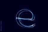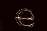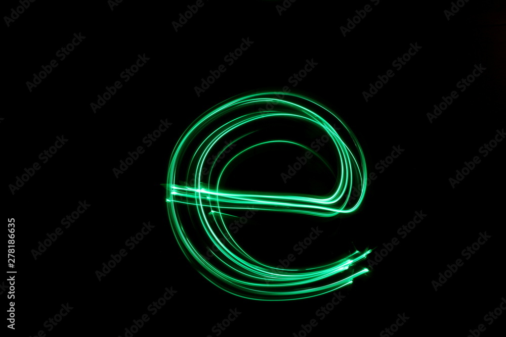 Long exposure photograph, light painting photography. Letter e of an alphabet series, single letter, in neon green light, against a black background