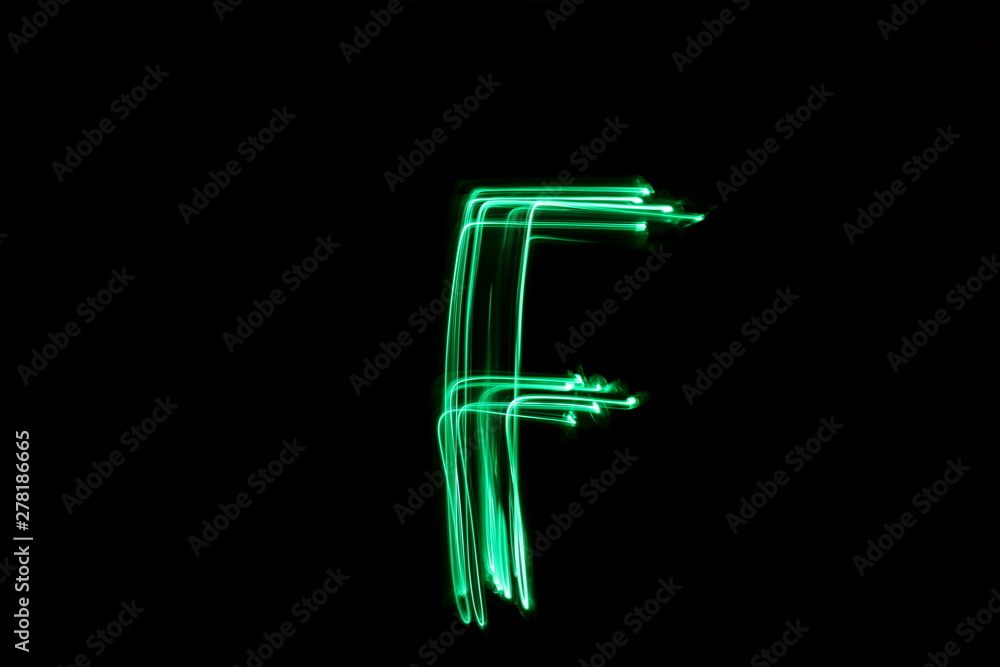 Long exposure photograph, light painting photography. Letter f of an alphabet series, single letter, in neon green light, against a black background