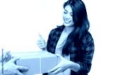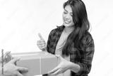 Beautiful woman receive package from goods delivery. It send from foreign country to customer woman very quickly. Attractive beautiful girl get satisfied it and give thumbs up with smile face.