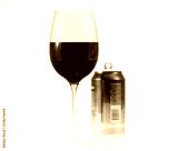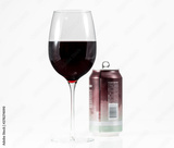 Aluminum can of California Pinot Noir behind a full glass of red wine showing move to single serving cans