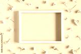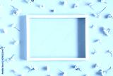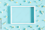 Beautiful flowers composition. Blank frame for text, spring and summer chamomile white flowers on pastel blue background. Flat lay, top view, copy space