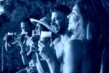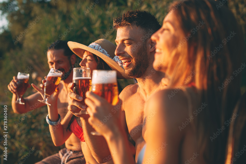 Happy group of young people drinking beer on a dock by the river during the summer sunny day