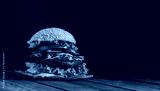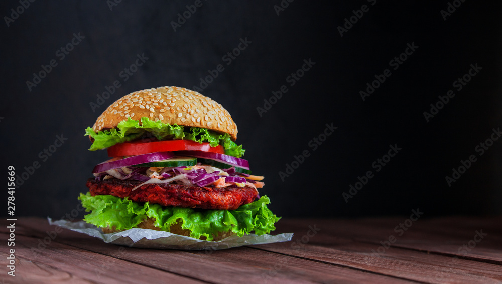 healthy veggie burger with beet patty coleslaw salad cucumber tomatoe lettuce on dark wooden background copy space