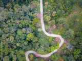 Aerial view of curved road cutting through the forest on high mountains. High angle view from drone.