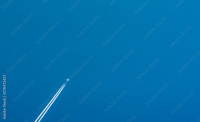 Airplane with white condensation tracks. Jet plane on clear blue sky with vapor trail. Travel by airplane concept. Trails of exhaust gas from airplane engine. Aircraft with white stripes.
