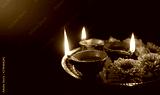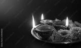 Colorful clay diya lamps lit during diwali celebration with copy space
