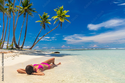 Beach suntan woman relaxing lying down on sand vacation tanning in tropical idyllic summer Caribbean blue sky and palm trees paradise getaway.