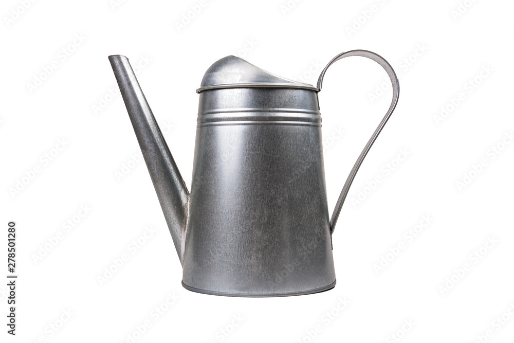 Simple shiny silver watering can isolated on white background, side view. Cut out vintage styled gardening tools, irrigation and flower care concept