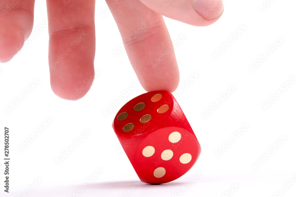 Helping your luck, cheating in games, dishonesty concept. A human hand pushing over a dice to make it show a six. Unfair ace in the sleeve kind of concept