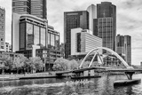 Beautiful black and white view of the Yarra River while a team of athletes rowing in the center of Melbourne, Australia