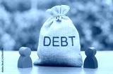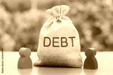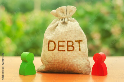 A bag with the inscription DEBT stands between two figures of people. Unclosed obligations between two persons, financial or moral debt. refusal to return debts. redemption and restructuring
