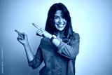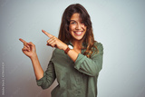 Young beautiful woman wearing green shirt standing over grey isolated background smiling and looking at the camera pointing with two hands and fingers to the side.