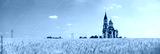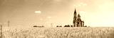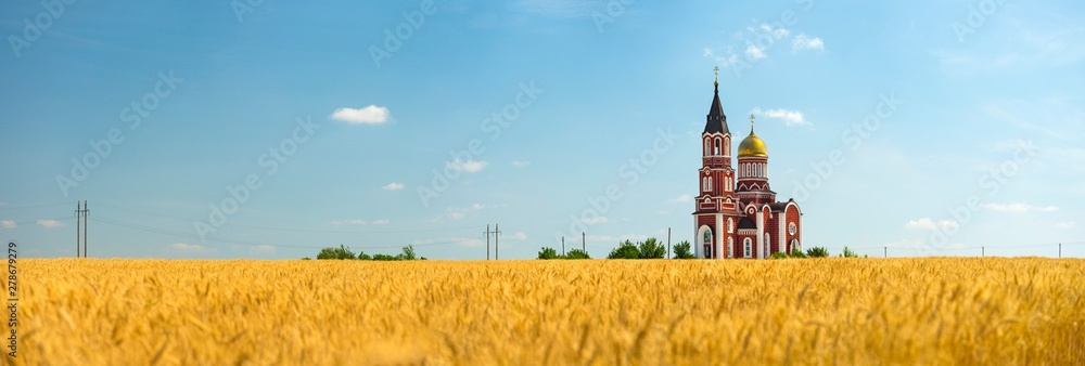 panorama of farm landscape with church and wheat field