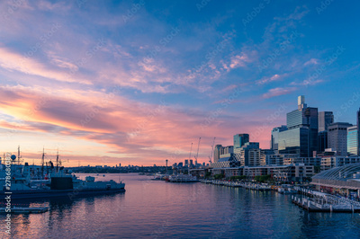 Sunset view over Sydney Harbour and business office buildings