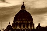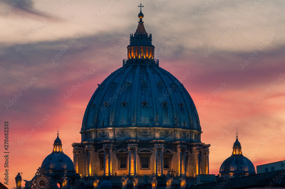 Close up of St Peters Basilica dome with epic sunset sky on the background