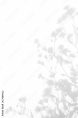 Gray shadows of the flowers and delicate grass on a white wall. Abstract neutral nature concept background. Space for text.