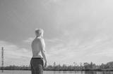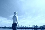 A young male blond in bathing shorts stands with his back against the backdrop of a lake and a light blue sky. Minimalistic image, the concept of summer vacation, relaxation. Place for text.