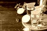 Tequila shots with lime slices, salt and mint on wooden background