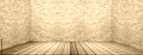 Wood floor and brick wall, empty room for background. Big empty room in grange style with wooden floor, bricks wall