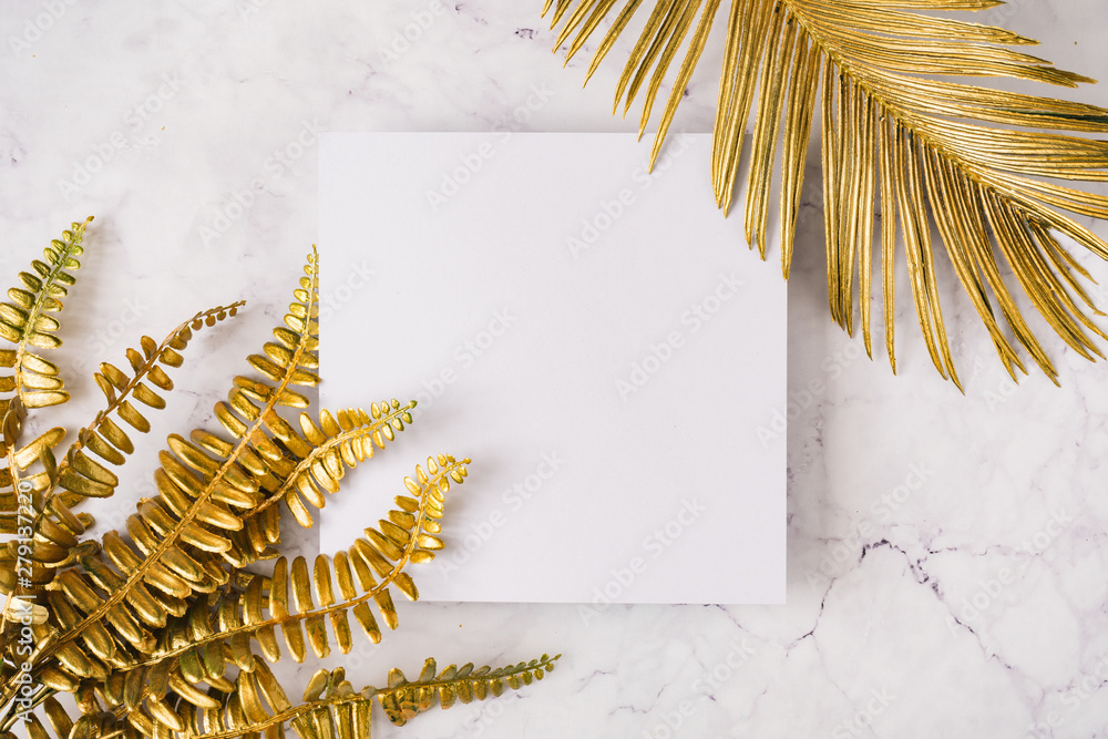 Creative layout made of golden tropical leaves and palms on white marble texture background. Minimal summer exotic concept with copy space. Border arrangement background.