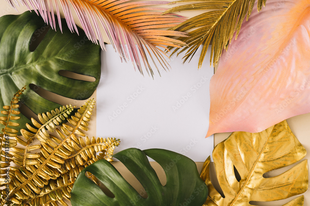 Creative layout made of colorful and golden tropical leaves and palms. Minimal summer exotic concept with copy space. Border arrangement background.