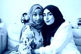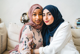 Portrait of two Muslim women with hijab on the sofa - Arab millennials embrace in an apartment