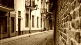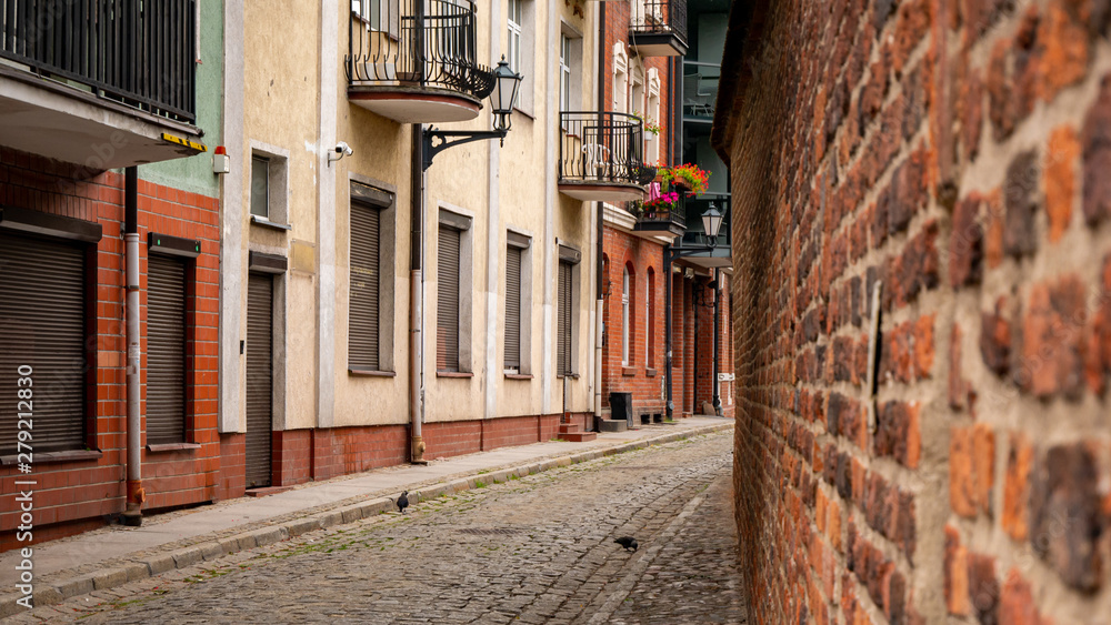 Old Town architecture and tenements with balcony in Torun, Poland.