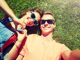 love and people concept - happy teenage couple in sunglasses lying on grass and taking selfie at summer