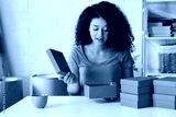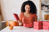 Young sad woman with dark curly hair sitting at the table with cup of coffee amazedly opening little red box at home