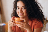Portrait of young beautiful smiling woman with dark curly hair holding orange cup of coffee in hands dreamily looking in camera at cozy home alone