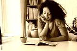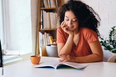 Young beautiful smiling woman with dark curly hair sitting at the table near window with orange cup of coffee dreamily reading book at cozy home