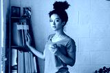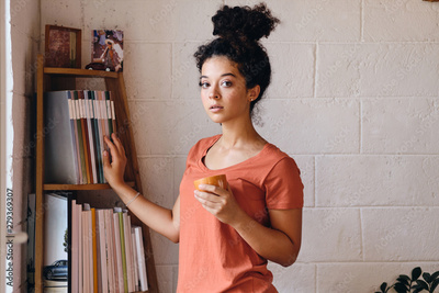 Young attractive woman with dark curly hair in T-shirt holding cup of coffee in hand and thoughtfully looking in camera standing near bookshelf at cozy home