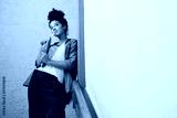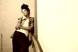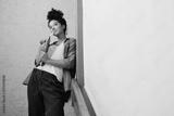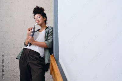 Young beautiful student girl with dark curly hair in khaki shirt and pants leaning on wall in university with textbooks in hands dreamily looking aside