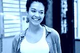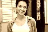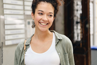 Young pretty smiling woman with dark curly hair in khaki shirt and white T-shirt happily looking aside on street