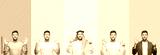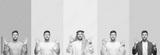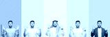Collage of handsome young man over colorful stripes isolated background relax and smiling with eyes closed doing meditation gesture with fingers. Yoga concept.