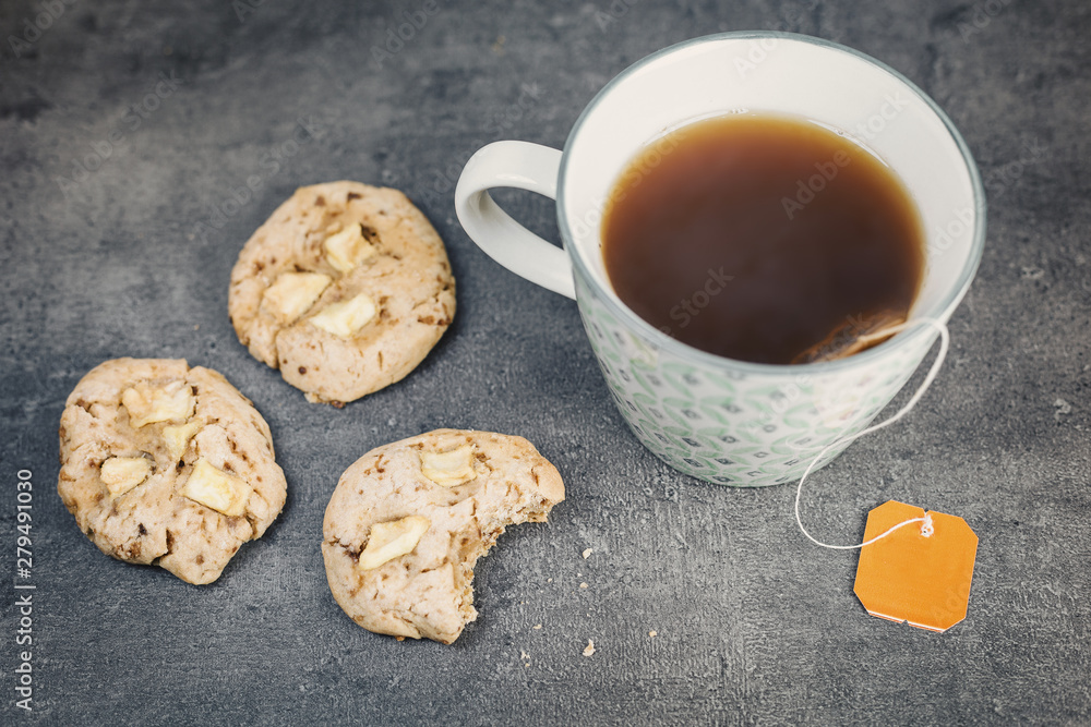 un goûter sain de 3 cookie fait maison et d'une tasse de thé bio sur un plan de travail béton moderne