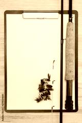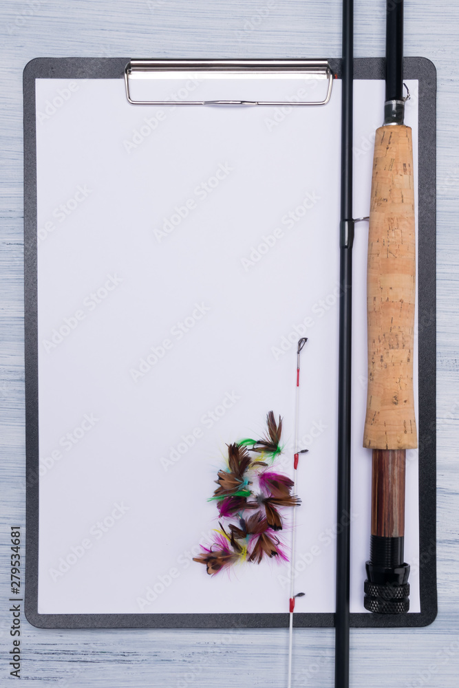 empty sheet of paper and tackle for fishing on it, a place for an inscription