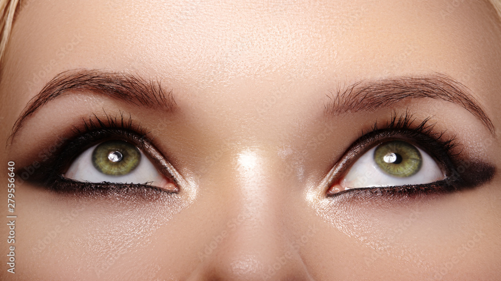 Beautiful Macro Shot of Female Eyes with Fashion Black Smoky Makeup. Cosmetics and Make-up. Dark Eyeshadows. Look Up