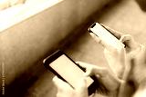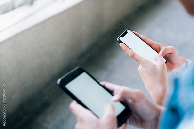 woman and man holding a smartphone, mock up of blank screen. using cell phone on lifestyle. Technology for communication concept.