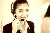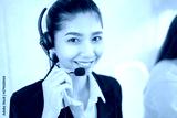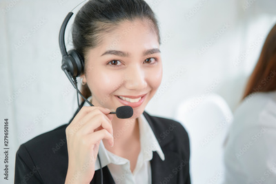 Smiling Asian businesswoman consultant wearing microphone headset of customer support phone operator at workplace.