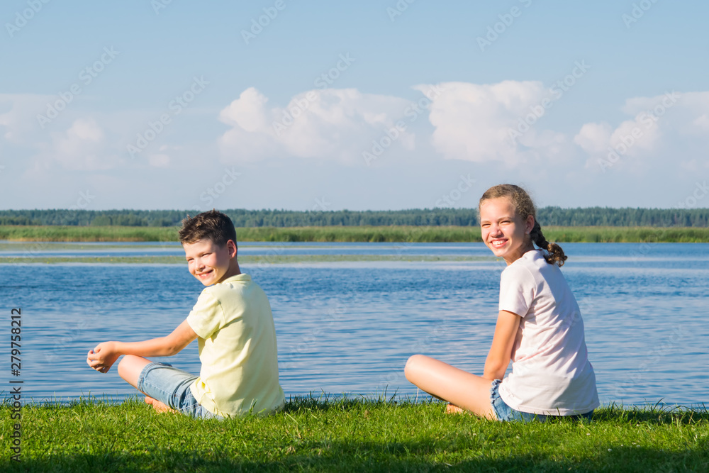 funny boy and girl sit on the green grass and do yoga, against the backdrop of a beautiful landscape