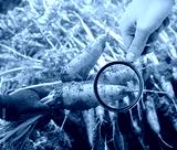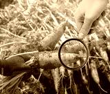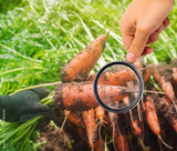 The food scientist checks the carrot for chemicals and pesticides. Growing organic vegetables. Eco-friendly products. Pomology. Agriculture and farming. GMO test. Study quality of soil and crop.