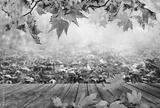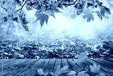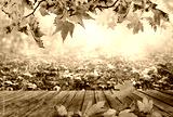Wooden table with orange leaves autumn background