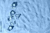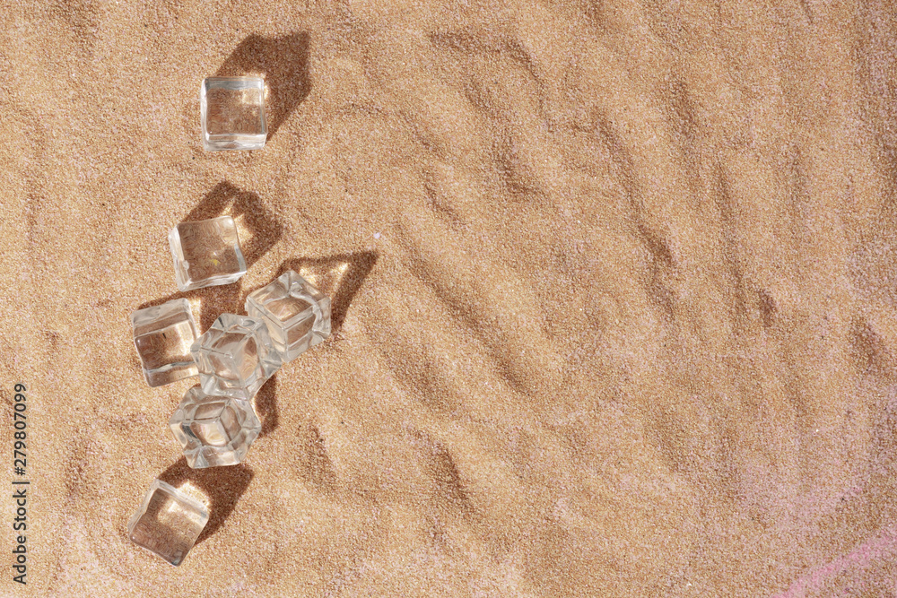 Summer day scene with ice cubes and shadows on sand background. Minimal sunlight tropical flat lay arrangement.